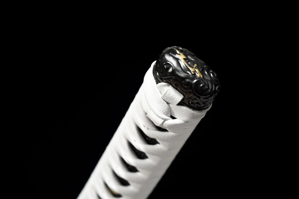 Enveloppé de cuir de galuchat authentique, le tsuka assure une prise ferme et confortable. Ce matériau, prisé pour sa texture antidérapante, garantit une manipulation sûre du Katana. Les menuki finement travaillés et les mekugi en bambou apportent une dimension supplémentaire à l’authenticité de la pièce, renforçant à la fois l’esthétique et la solidité du manche.